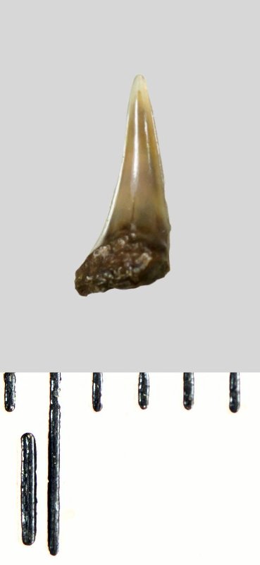 Зуб (фрагмент). Акула. Lamniformes gen. et sp. indet. Классификация: Хордовые Chordata, Позвоночные Vertebrata, Хрящевые рыбы Chondrichthyes, Пластиножаберные Elasmobranchii, Акулы Selachii, Ламнообразные Lamniformes