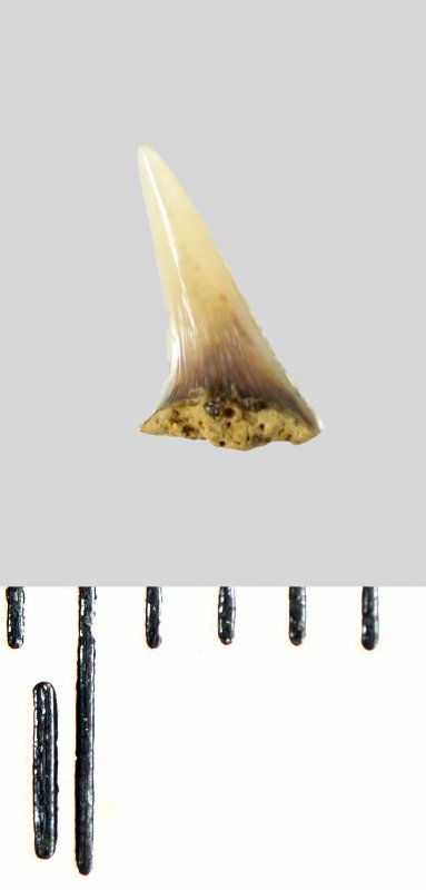 Зуб (фрагмент). Акула. Lamniformes gen. et sp. indet. Классификация: Хордовые Chordata, Позвоночные Vertebrata, Хрящевые рыбы Chondrichthyes, Пластиножаберные Elasmobranchii, Акулы Selachii, Ламнообразные Lamniformes