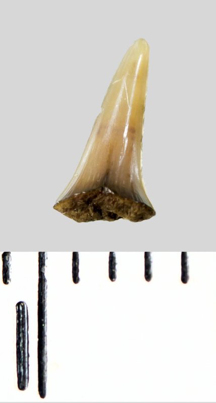 Зуб (фрагмент). Акула. Lamniformes gen. et sp. indet. Классификация: Хордовые Chordata, Позвоночные Vertebrata, Хрящевые рыбы Chondrichthyes, Пластиножаберные Elasmobranchii, Акулы Selachii, Ламнообразные Lamniformes