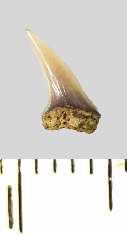 Зуб (фрагмент). Акула. Lamniformes gen. et sp. indet. Классификация: Хордовые Chordata, Позвоночные Vertebrata, Хрящевые рыбы Chondrichthyes, Пластиножаберные Elasmobranchii, Акулы Selachii, Ламнообразные Lamniformes