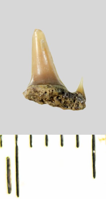Зуб (фрагмент). Акула. Lamniformes gen. et sp. indet. Классификация: Хордовые Chordata, Позвоночные Vertebrata, Хрящевые рыбы Chondrichthyes, Пластиножаберные Elasmobranchii, Акулы Selachii, Ламнообразные Lamniformes