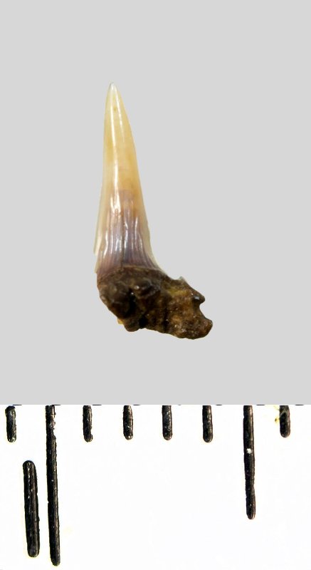 Зуб (фрагмент). Акула. Lamniformes gen. et sp. indet. Классификация: Хордовые Chordata, Позвоночные Vertebrata, Хрящевые рыбы Chondrichthyes, Пластиножаберные Elasmobranchii, Акулы Selachii, Ламнообразные Lamniformes