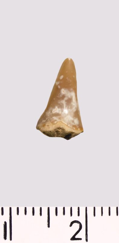 Зуб (фрагмент). Акула. Lamniformes gen. et sp. indet. Классификация: Хордовые Chordata, Позвоночные Vertebrata, Хрящевые рыбы Chondrichthyes, Пластиножаберные Elasmobranchii