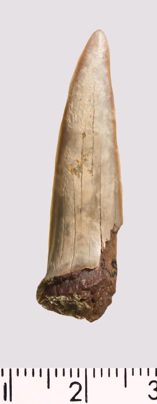 Зуб (фрагмент). Акула. Scapanorhynchus ex. gr. gigas Woodward 1889. Классификация: Хордовые Chordata, Позвоночные Vertebrata, Хрящевые рыбы Chondrichthyes, Пластиножаберные Elasmobranchii