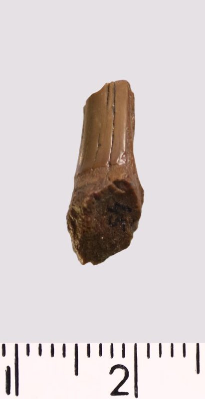 Зуб (фрагмент). Акула. Scapanorhynchus ex gr. gigas Woodward 1889. Классификация: Хордовые Chordata, Позвоночные Vertebrata, Хрящевые рыбы Chondrichthyes, Пластиножаберные Elasmobranchii
