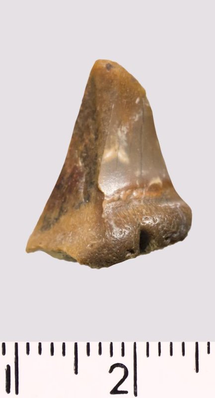 Зуб (фрагмент). Акула. Scapanorhynchus ex gr. gigas Woodward 1889. Классификация: Хордовые Chordata, Позвоночные Vertebrata, Хрящевые рыбы Chondrichthyes, Пластиножаберные Elasmobranchii