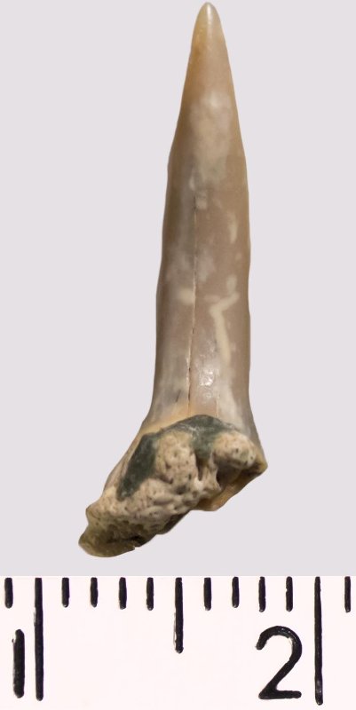 Зуб (фрагмент). Акула. Lamniformes gen. et sp. indet. Классификация: Хордовые Chordata, Позвоночные Vertebrata, Хрящевые рыбы Chondrichthyes, Пластиножаберные Elasmobranchii