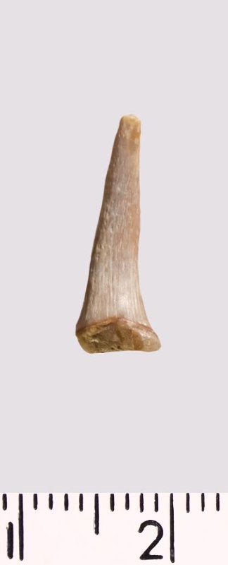 Зуб (фрагмент). Акула. Scapanorhynchus rhaphiodon Agassiz 1843. Классификация: Хордовые Chordata, Позвоночные Vertebrata, Хрящевые рыбы Chondrichthyes, Пластиножаберные Elasmobranchii