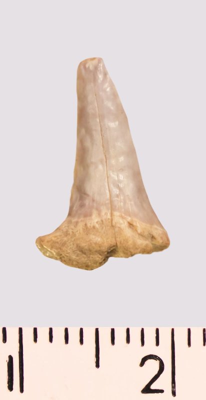 Зуб (фрагмент). Акула. Scapanorhynchus rapax Quaas, 1902. Классификация: Хордовые Chordata, Позвоночные Vertebrata, Хрящевые рыбы Chondrichthyes, Пластиножаберные Elasmobranchii