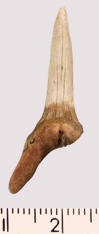 Зуб. Акула. Scapanorhynchus rapax Quaas, 1902. Классификация: Хордовые Chordata, Позвоночные Vertebrata, Хрящевые рыбы Chondrichthyes, Пластиножаберные Elasmobranchii