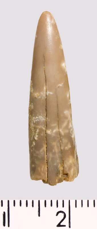 Зуб (фрагмент). Акула. Scapanorhynchus gigas Woodward 1889. Классификация: Хордовые Chordata, Позвоночные Vertebrata, Хрящевые рыбы Chondrichthyes, Пластиножаберные Elasmobranchii