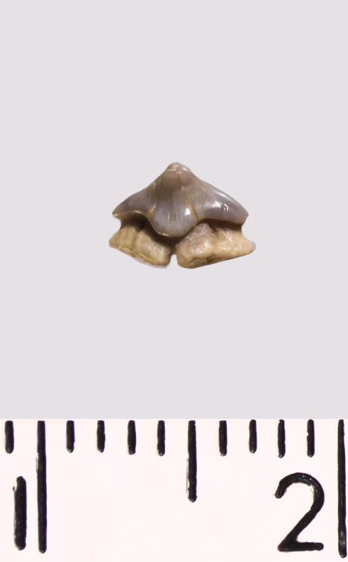 Зуб. Скат. Sclerorhynchus sp. Классификация: Хордовые Chordata, Позвоночные Vertebrata, Хрящевые рыбы Chondrichthyes, Пластиножаберные Elasmobranchii