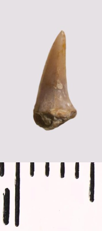 Зуб (фрагмент). Акула. Scapanorhynchus sp. Классификация: Хордовые Chordata, Позвоночные Vertebrata, Хрящевые рыбы Chondrichthyes, Пластиножаберные Elasmobranchii
