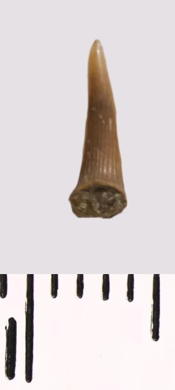 Зуб (фрагмент). Акула. Scapanorhynchus sp. Классификация: Хордовые Chordata, Позвоночные Vertebrata, Хрящевые рыбы Chondrichthyes, Пластиножаберные Elasmobranchii