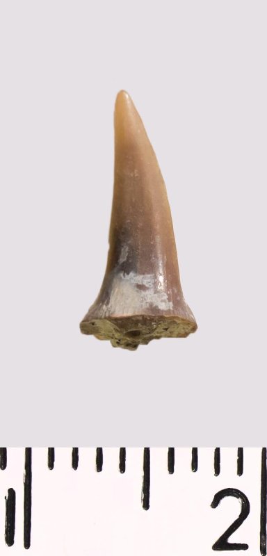 Зуб (фрагмент). Акула. Scapanorhynchus texanus (Romer, 1849). Классификация: Хордовые Chordata, Позвоночные Vertebrata, Хрящевые рыбы Chondrichthyes, Пластиножаберные Elasmobranchii
