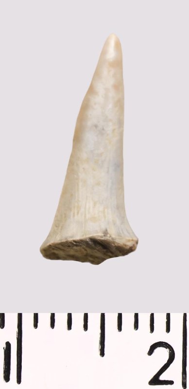 Зуб (фрагмент). Акула. Scapanorhynchus texanus (Romer, 1849). Классификация: Хордовые Chordata, Позвоночные Vertebrata, Хрящевые рыбы Chondrichthyes, Пластиножаберные Elasmobranchii