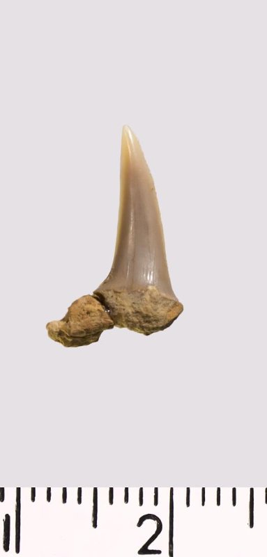 Зуб. Акула. Scapanorhynchus sp. Классификация: Хордовые Chordata, Позвоночные Vertebrata, Хрящевые рыбы Chondrichthyes, Пластиножаберные Elasmobranchii