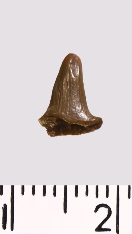 Зуб (фрагмент). Акула. Hybodus sp. Классификация: Хордовые Chordata, Позвоночные Vertebrata, Хрящевые рыбы Chondrichthyes, Пластиножаберные Elasmobranchii