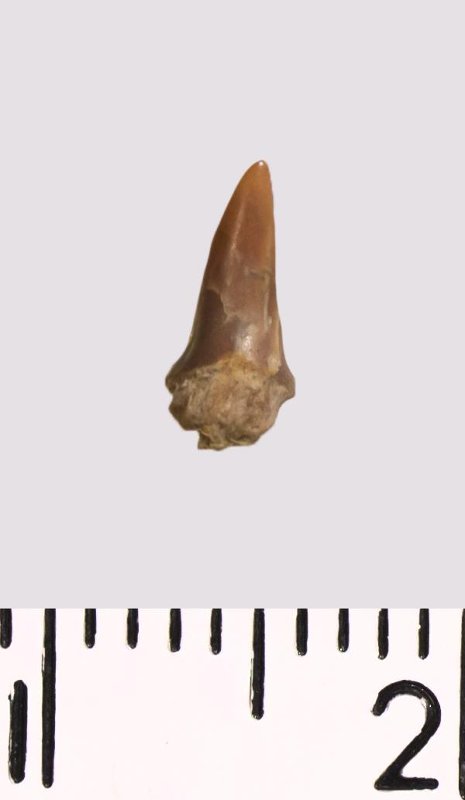 Зуб (фрагмент). Акула. Odontaspis macrorhiza (Cope) Leriche, 1902. Классификация: Хордовые Chordata, Позвоночные Vertebrata, Хрящевые рыбы Chondrichthyes, Пластиножаберные Elasmobranchii
