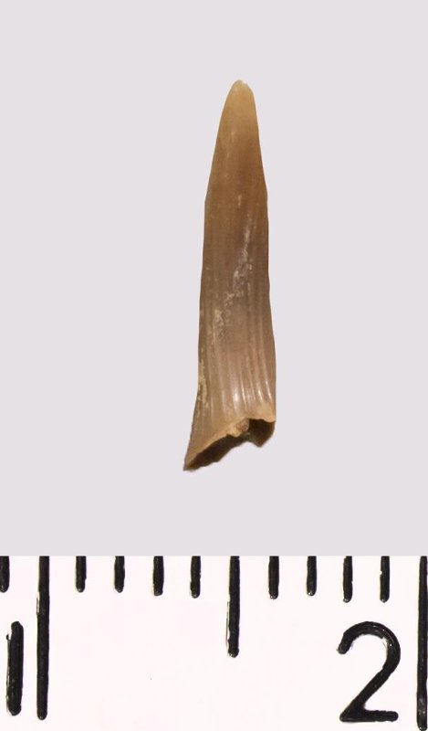 Зуб (фрагмент). Акула. Scapanorhynchus rhaphiodon Agassiz 1843. Классификация: Хордовые Chordata, Позвоночные Vertebrata, Хрящевые рыбы Chondrichthyes, Пластиножаберные Elasmobranchii