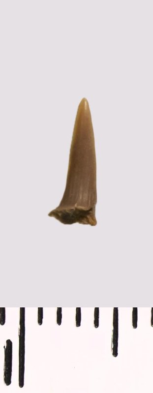 Зуб (фрагмент). Акула. Scapanorhynchus rhaphiodon Agassiz, 1843. Классификация: Хордовые Chordata, Позвоночные Vertebrata, Хрящевые рыбы Chondrichthyes, Пластиножаберные Elasmobranchii