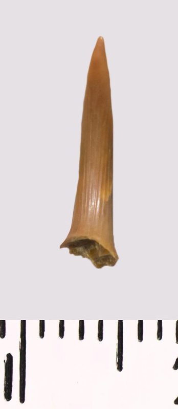 Зуб (фрагмент). Акула. Scapanorhynchus rhaphiodon Agassiz, 1843. Классификация: Хордовые Chordata, Позвоночные Vertebrata, Хрящевые рыбы Chondrichthyes, Пластиножаберные Elasmobranchii