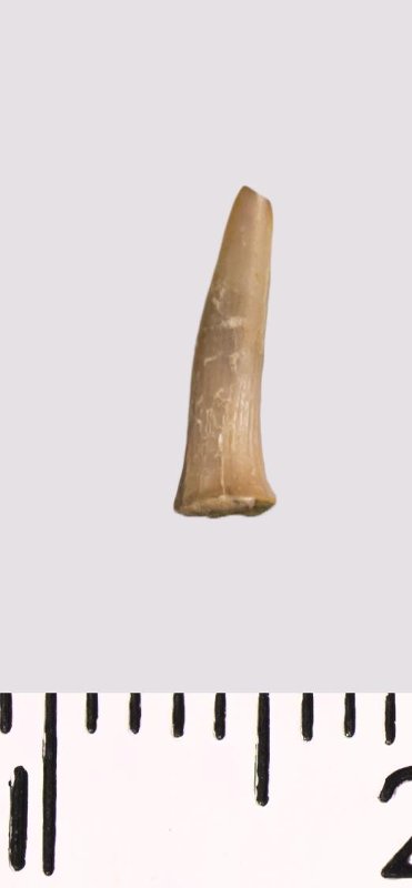 Зуб (фрагмент). Акула. Scapanorhynchus rhaphiodon Agassiz, 1843. Классификация: Хордовые Chordata, Позвоночные Vertebrata, Хрящевые рыбы Chondrichthyes, Пластиножаберные Elasmobranchii