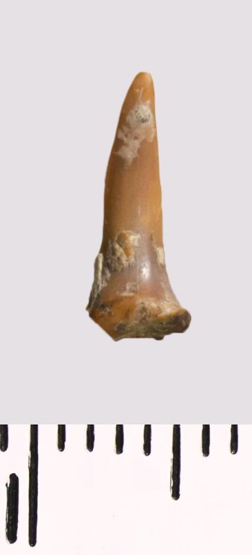 Зуб (фрагмент). Акула. Scapanorhynchus rhaphiodon Agassiz, 1843. Классификация: Хордовые Chordata, Позвоночные Vertebrata, Хрящевые рыбы Chondrichthyes, Пластиножаберные Elasmobranchii