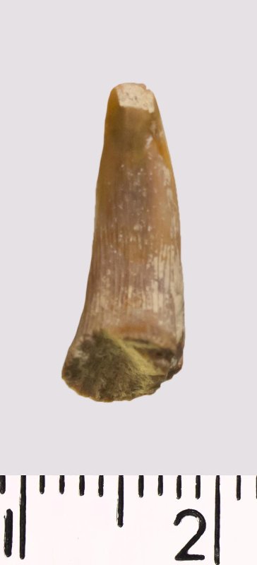 Зуб (фрагмент). Акула. Scapanorhynchus texanus (Romer, 1849). Классификация: Хордовые Chordata, Позвоночные Vertebrata, Хрящевые рыбы Chondrichthyes, Пластиножаберные Elasmobranchii