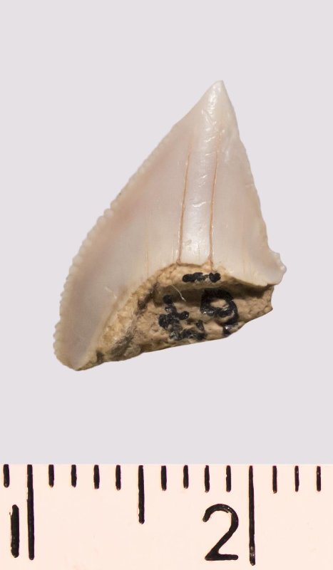 Зуб (фрагмент). Акула. Anacorax kaupi (Agassiz, 1843). Классификация: Хордовые Chordata, Позвоночные Vertebrata, Хрящевые рыбы Chondrichthyes, Пластиножаберные Elasmobranchii