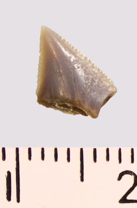 Зуб (фрагмент). Акула. Anacorax kaupi (Agassiz, 1843). Классификация: Хордовые Chordata, Позвоночные Vertebrata, Хрящевые рыбы Chondrichthyes, Пластиножаберные Elasmobranchii