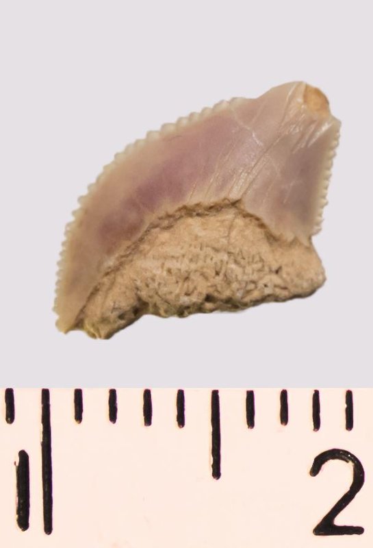 Зуб (фрагмент). Акула. Anacorax kaupi (Agassiz, 1843). Классификация: Хордовые Chordata, Позвоночные Vertebrata, Хрящевые рыбы Chondrichthyes, Пластиножаберные Elasmobranchii