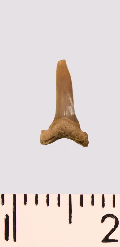 Зуб. Акула. Scapanorhynchus rhaphiodon Agassiz, 1843. Классификация: Хордовые Chordata, Позвоночные Vertebrata, Хрящевые рыбы Chondrichthyes, Пластиножаберные Elasmobranchii