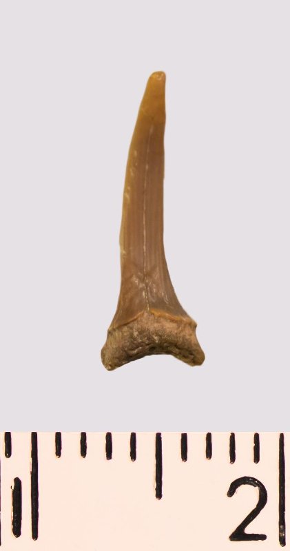 Зуб. Акула. Scapanorhynchus rhaphiodon Agassiz, 1843. Классификация: Хордовые Chordata, Позвоночные Vertebrata, Хрящевые рыбы Chondrichthyes, Пластиножаберные Elasmobranchii