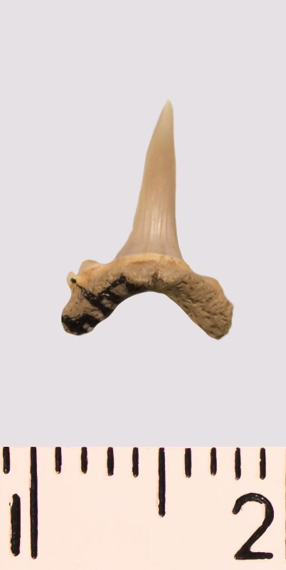 Зуб. Акула. Scapanorhynchus rhaphiodon Agassiz, 1843. Классификация: Хордовые Chordata, Позвоночные Vertebrata, Хрящевые рыбы Chondrichthyes, Пластиножаберные Elasmobranchii