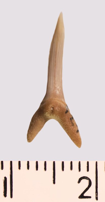 Зуб. Акула. Scapanorhynchus rhaphiodon Agassiz, 1843. Классификация: Хордовые Chordata, Позвоночные Vertebrata, Хрящевые рыбы Chondrichthyes, Пластиножаберные Elasmobranchii