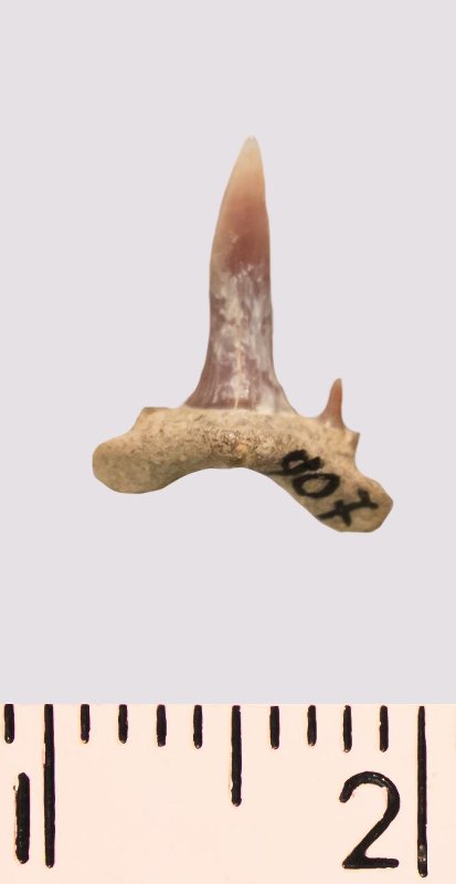 Зуб. Акула. Scapanorhynchus rhaphiodon Agassiz, 1843. Классификация: Хордовые Chordata, Позвоночные Vertebrata, Хрящевые рыбы Chondrichthyes, Пластиножаберные Elasmobranchii