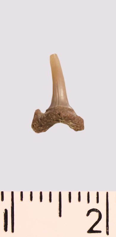 Зуб. Акула. Scapanorhynchus rhaphiodon Agassiz, 1843. Классификация: Хордовые Chordata, Позвоночные Vertebrata, Хрящевые рыбы Chondrichthyes, Пластиножаберные Elasmobranchii