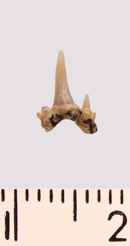 Зуб. Акула. Scapanorhynchus rhaphiodon Agassiz, 1843. Классификация: Хордовые Chordata, Позвоночные Vertebrata, Хрящевые рыбы Chondrichthyes, Пластиножаберные Elasmobranchii