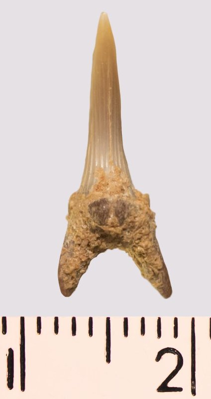 Зуб. Акула. Scapanorhynchus rhaphiodon Agassiz, 1843. Классификация: Хордовые Chordata, Позвоночные Vertebrata, Хрящевые рыбы Chondrichthyes, Пластиножаберные Elasmobranchii