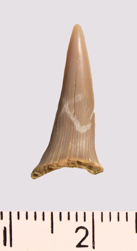Зуб (фрагмент). Акула. Scapanorhynchus rapax Quaas, 1902. Классификация: Хордовые Chordata, Позвоночные Vertebrata, Хрящевые рыбы Chondrichthyes, Пластиножаберные Elasmobranchii