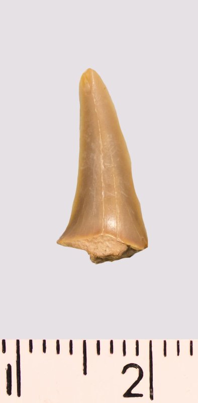 Зуб (фрагмент). Акула. Scapanorhynchus rapax Quaas, 1902. Классификация: Хордовые Chordata, Позвоночные Vertebrata, Хрящевые рыбы Chondrichthyes, Пластиножаберные Elasmobranchii