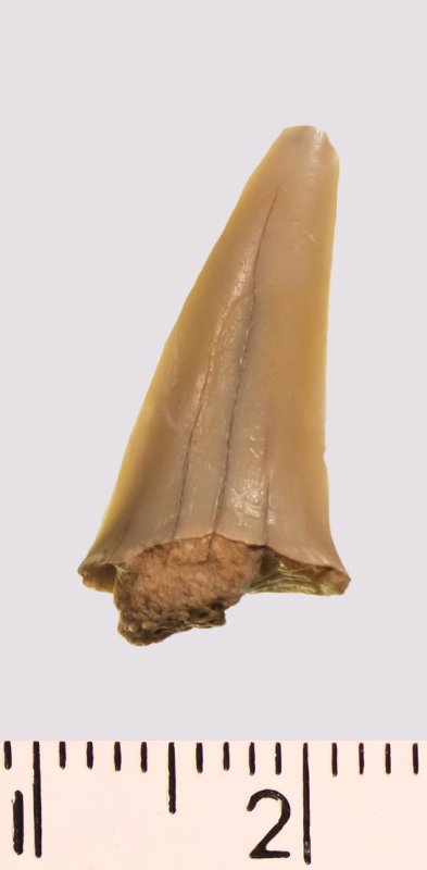 Зуб (фрагмент). Акула. Scapanorhynchus rapax Quaas, 1902. Классификация: Хордовые Chordata, Позвоночные Vertebrata, Хрящевые рыбы Chondrichthyes, Пластиножаберные Elasmobranchii