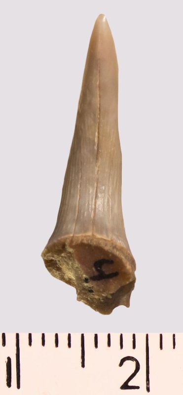 Зуб (фрагмент). Акула. Scapanorhynchus rapax Quaas, 1902. Классификация: Хордовые Chordata, Позвоночные Vertebrata, Хрящевые рыбы Chondrichthyes, Пластиножаберные Elasmobranchii