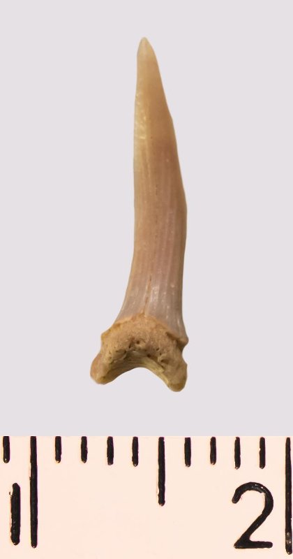 Зуб. Акула. Scapanorhynchus rhaphiodon Agassiz, 1843. Классификация: Хордовые Chordata, Позвоночные Vertebrata, Хрящевые рыбы Chondrichthyes, Пластиножаберные Elasmobranchii
