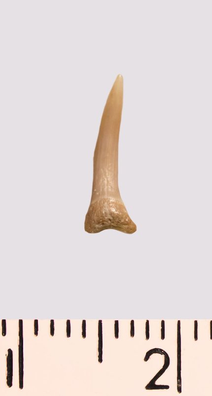 Зуб. Акула. Scapanorhynchus rhaphiodon Agassiz, 1843. Классификация: Хордовые Chordata, Позвоночные Vertebrata, Хрящевые рыбы Chondrichthyes, Пластиножаберные Elasmobranchii