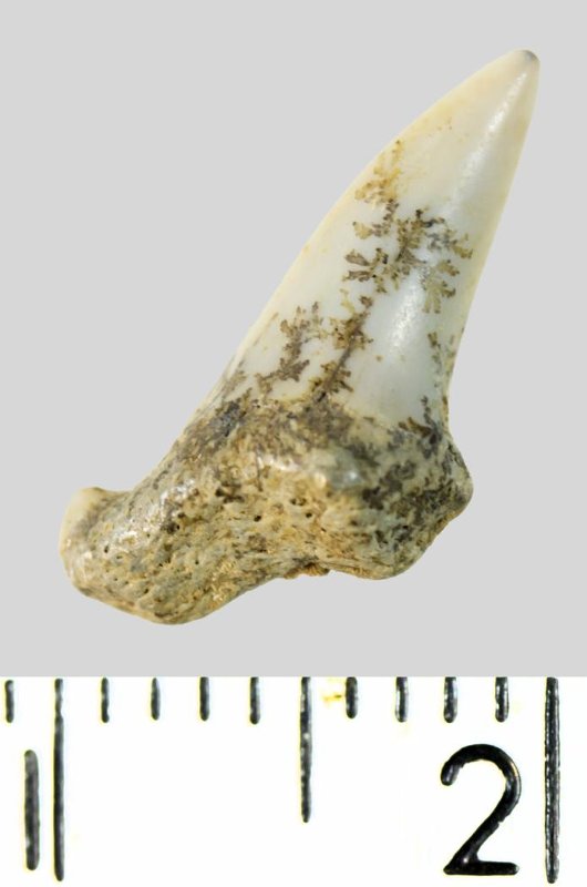 Зуб. Акула. Odontaspis macrorhiza (Cope) Leriche, 1902. Классификация: Хордовые Chordata, Позвоночные Vertebrata, Хрящевые рыбы Chondrichthyes, Пластиножаберные Elasmobranchii, Акулы Selachii, Ламнообразные Lamniformes