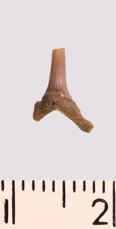 Зуб. Акула. Scapanorhynchus rhaphiodon Agassiz, 1843. Классификация: Хордовые Chordata, Позвоночные Vertebrata, Хрящевые рыбы Chondrichthyes, Пластиножаберные Elasmobranchii