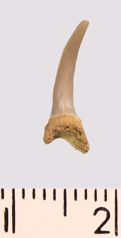 Зуб. Акула. Scapanorhynchus rhaphiodon Agassiz, 1843. Классификация: Хордовые Chordata, Позвоночные Vertebrata, Хрящевые рыбы Chondrichthyes, Пластиножаберные Elasmobranchii