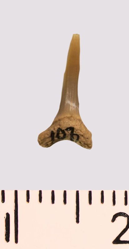 Зуб. Акула. Scapanorhynchus rhaphiodon Agassiz, 1843. Классификация: Хордовые Chordata, Позвоночные Vertebrata, Хрящевые рыбы Chondrichthyes, Пластиножаберные Elasmobranchii